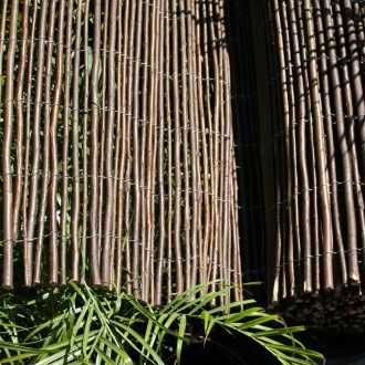 Willow fencing, durable, lightweight and, boasting a rich brown appearance is an ideal product selection whether rustic charm or contemporary appeal is the design intent. Constructed of individual freshwater willow’s and fastened by a thin, discrete wire, willow fencing is ideal for wall and ceiling coverings, column cladding, privacy screening and is an excellent substitution for unsightly construction fencing. Easy to install…Willow Fencing can be easily secured to vertical and horizontal posts by utilizing the wire and fastening with an electrical staple. Overhead applications can be secured with pin nails directly through the willow and wire connection.